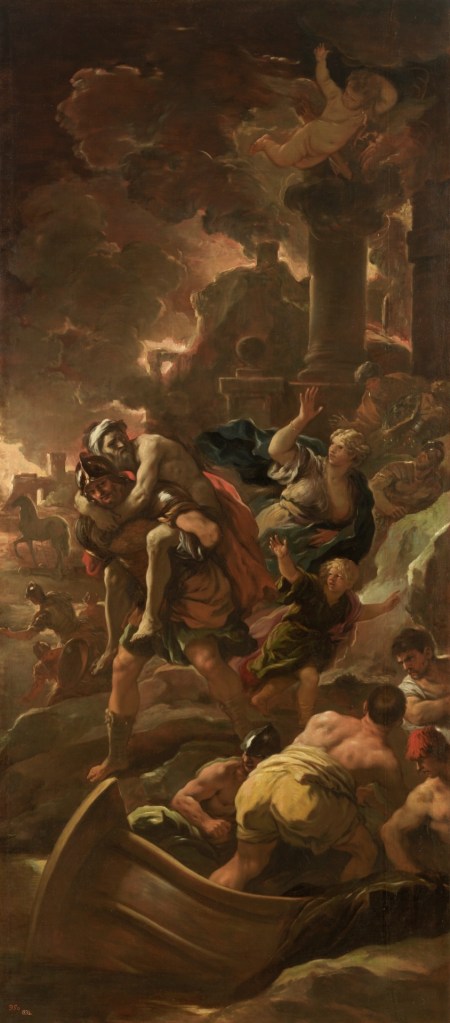 En el siguiente enlace del Museo del Prado se explica el lienzo de Luca Giordano de cómo Eneas huye de Troya con su padre Anquises y su hijo Ascanio. https://www.museodelprado.es/coleccion/obra-de-arte/eneas-fugitivo-con-su-familia/cd5f5e6f-3945-44e2-8177-5395ad2fcf70